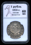 1 рубль — Конец скипетра доходит до буквы О 1815 СПБ МФ. В Слабе® MS 60