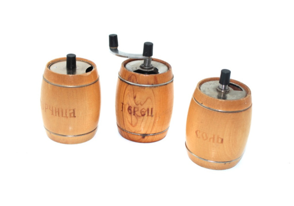 Лот предметов: Столовый набор: соль, горчица, перец. 3 шт. дерево, металл. Высота 7 см (СССР)