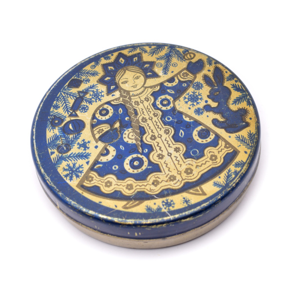 Винтажная жестяная коробка от леденцов «Снегурочка». ⌀ 10 см (СССР)