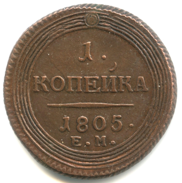 1 копейка — Кольцевик 1805 ЕМ. Кабинетная патина. Редкая в подобной сохранности (Российская Империя)