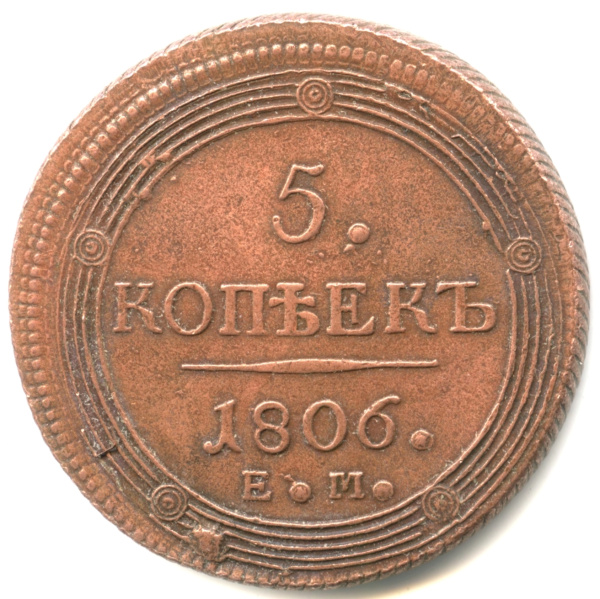 5 копеек — Кольцевик. Орел 2 типа: на аверсе точка с 2 ободками, корона большая. 1806 ЕМ. Кабинетная патина (Российская Империя)