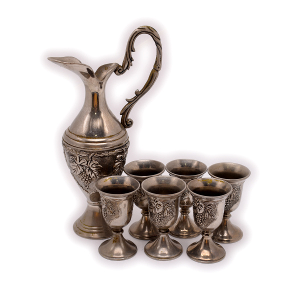 Набор для вина, состоящий из кувшина и шести рюмок с тисненым узором в виде виноградной лозы. Металл. Размер 12×22 см