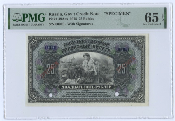 25 рублей Временное Правительство 1918. В слабе. Образец. Редкость. В слабе PMG 65 Unc (Российская Империя)