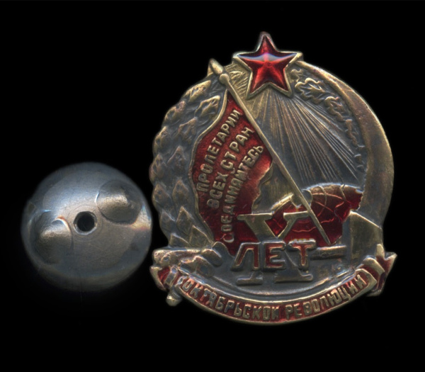 Знак «10 лет Октябрьской революции». Крепление: винт. Тяжелый, эмаль. Реставрация 1927 (СССР)