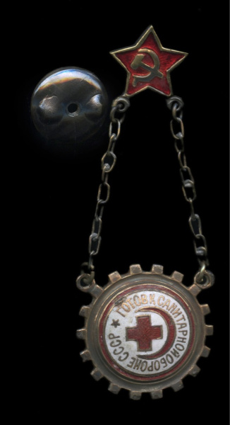 Знак «Готов к санитарной обороне СССР». Крепление: винт. Тяжелый, эмаль. Реставрация 1935 (СССР)