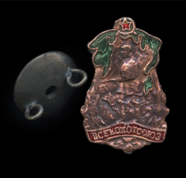 Знак «Всероссийского кооперативного охотничьего союза (Всекохотсоюз)». Крепление: винт. Тяжелый, эмаль. Реставрация 1925 (СССР)