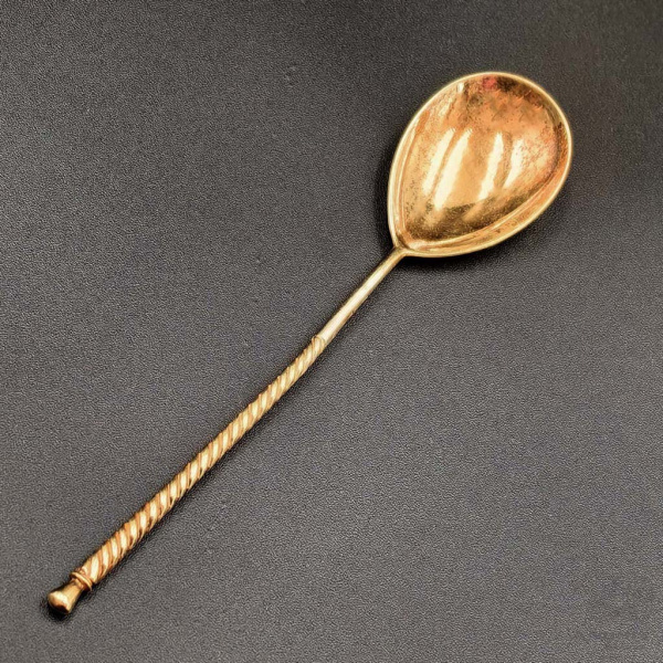 Ложка чайная. Клейма 875 звезда, ФК4 — Красносельская ювелирная фабрика. Длина 12,7 см., вес 15,80гр. Витая ручка, гравировка, позолота 1964. Состояни…