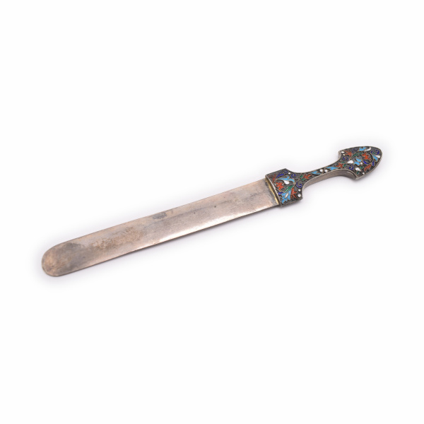 Нож для писем. Перегородчатая эмаль на рукоятке. Клеймо. Серебро 84 пробы. Размер 17×6 см. 29 г. Именник «АД» (Российская Империя)