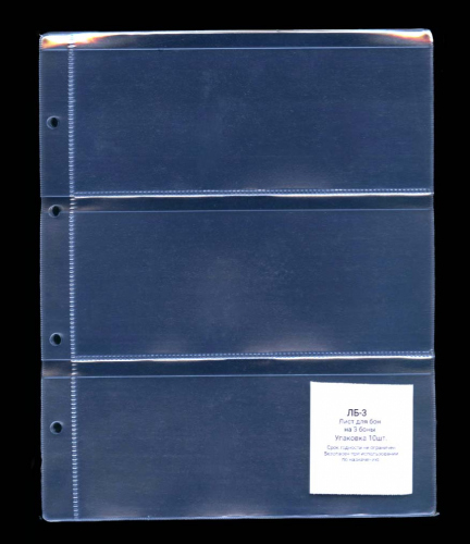 Листы в альбом стандарта OPTIMA под боны на три позиции. 10 штук. Новые в упаковке 250×200мм (Россия)