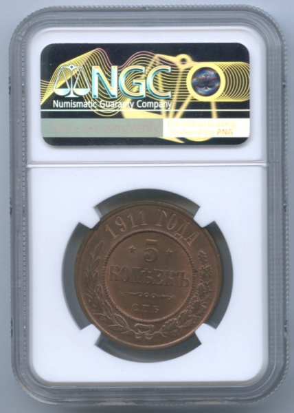 5 копеек 1911 CПБ. В слабе. В слабе NGC MS 64 RB (Российская Империя)