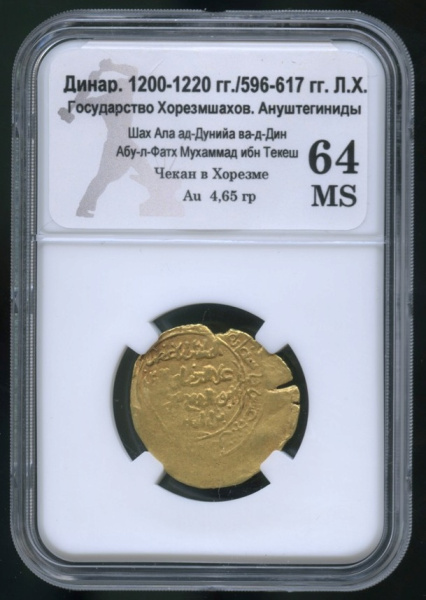 динар 1200−1220 годы. В слабе. Государство Хорезмшахов Ануштегиниды (596 — 617 годы Хиджры). Мухаммад ибн Текеш. Монетный двор — Хорезм. В слабе MS 64…