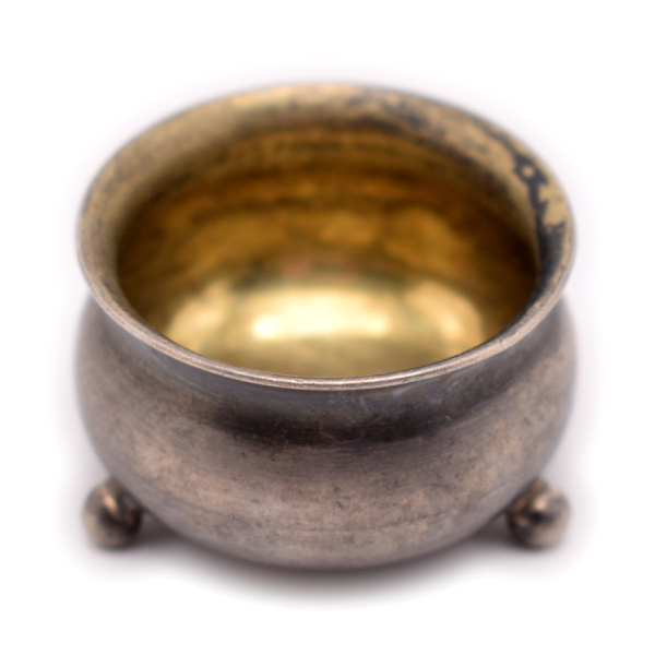 Солонка серебряная 1873 год. Внутри позолоченная, 84 проба. Клейма «Хлебников», ранний тип работ. Масса 17,1 гр. Ag. Размер 4×2,3 см. масса 17,1 гр (Р…