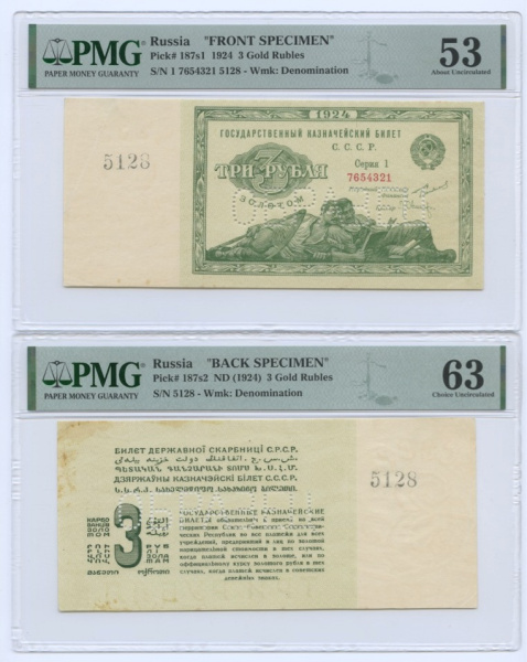 3 рубля золотом Образец 1924. В слабе. Обе стороны отдельно. В слабе PMG 53−63 (СССР)