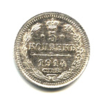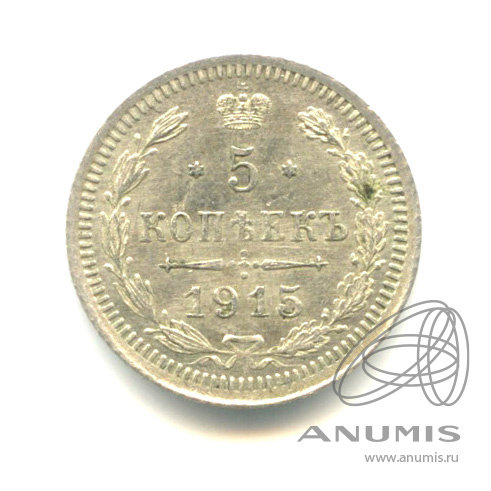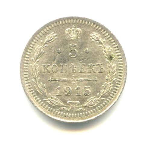 Монета регулярного выпуска: 5 копеек 1915 года «Орел 3 типа». 5 копеек 1859 — 1915 гг. Российская Империя: Николай II (1894 — 1917). Минцмейстер: Виктор Петрович Смирнов (1912−1917). Серебро 500, 1 г, ø 15 мм, Гурт: Рубчатый. Тираж: 3000000 шт.