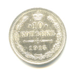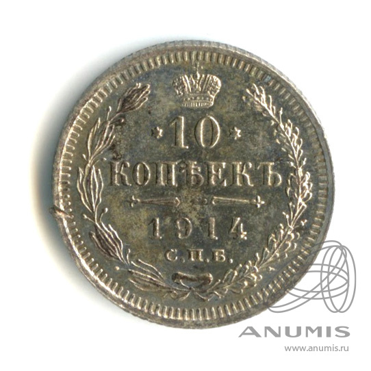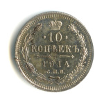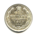 Монета регулярного выпуска: 10 копеек 1914 года «Орел нового типа». 10 копеек 1859 — 1917 гг. Российская Империя: Николай II (1894 — 1917). Монетный двор: Санкт-Петербургский монетный двор, г. Санкт-Петербург. Минцмейстер: Виктор Петрович Смирнов (1912−1917). Серебро 500, 2 г, ø 18 мм, Гурт: Рубчатый. Тираж: 51250015 шт.
