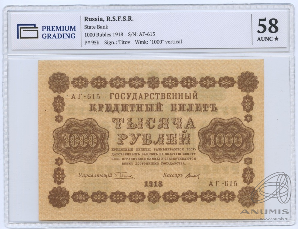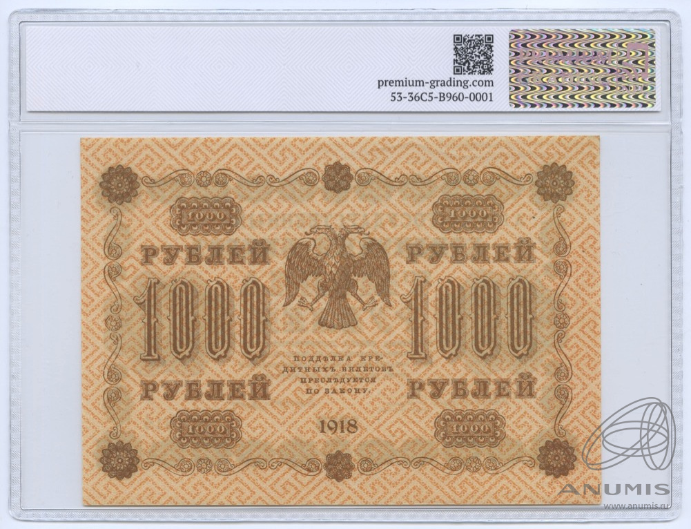 1000 рублей Титов 1918. В слабе. В слабе PREMIUM GRADING 58 Unc. Титов