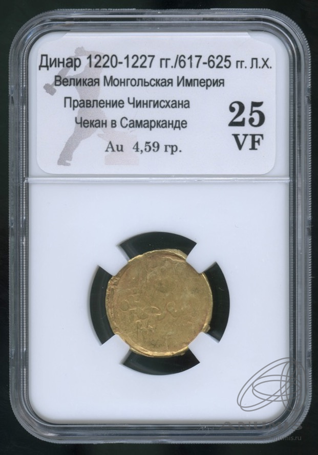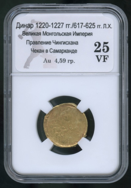 динар 1220−1227 г. г. В слабе. Великая Монгольская Империя (617−625 годы Хиджры). Чингизхан. Монетный двор — Самарканд. В слабе 25 VF