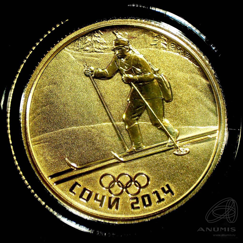 Юбилейная монета: 50 рублей 2014 года «Сочи 2014. Биатлон». XXII Олимпийские зимние игры и XI Паралимпийские зимние игры 2014 года в г. Сочи. Российская Федерация: Россия современная (1997 — 2020). Монетный двор: Санкт-Петербургский монетный Двор. Золото 999, 8 г, ø 23 мм, Гурт: Рубчатый. Тираж: до 20000 шт. Серия: XXII Олимпийские зимние игры и XI Паралимпийские зимние игры 2014 года в г. Сочи.