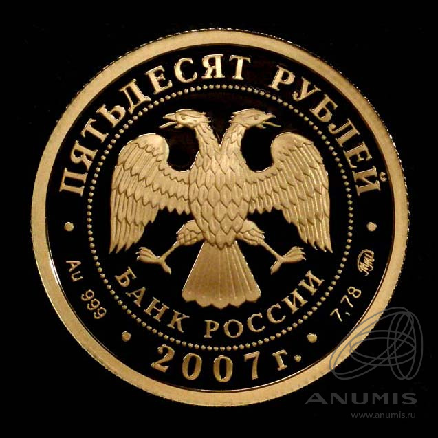 в центре — эмблема Банка России (двуглавый орёл с опущенными крыльями, под ним — надпись полукругом «БАНК РОССИИ»), обрамленная кругом из точек и надписями по кругу — вверху: «ПЯТЬДЕСЯТ РУБЛЕЙ», внизу: слева — обозначения драгоценного металла и пробы сплава, в центре — дата выпуска «2007 г.», справа — содержание химически чистого металла и товарный знак монетного двора.