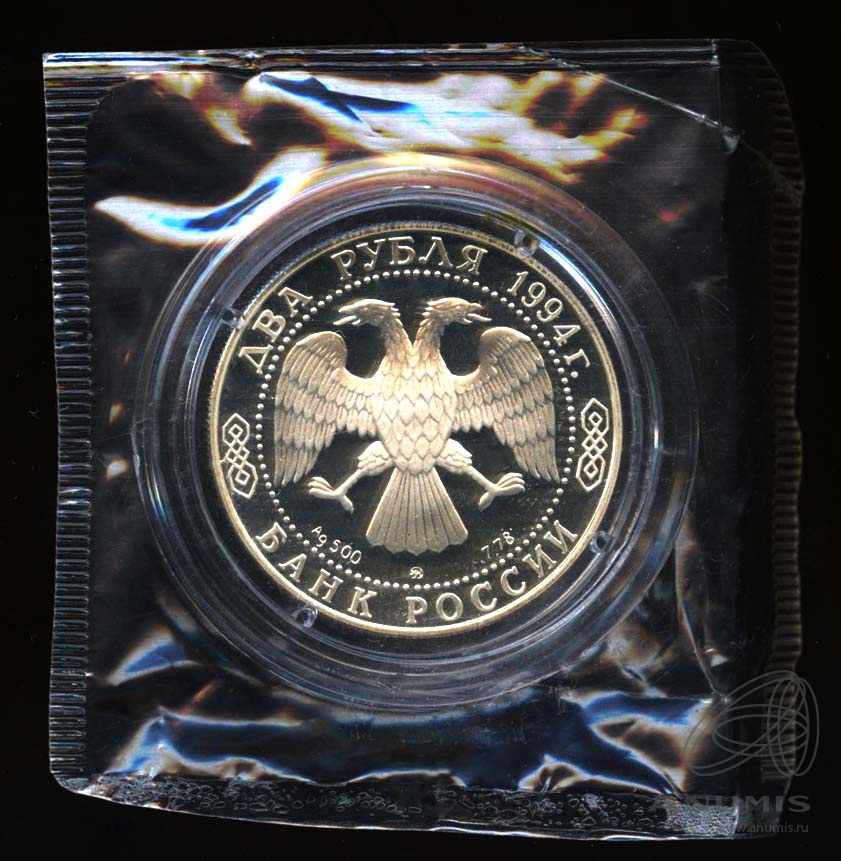 изображение двуглавого орла (художник И. Билибин), по кругу надписи: вверху — «ДВА РУБЛЯ 1994 г.», внизу — «БАНК РОССИИ».В нижней части — обозначение металла, проба сплава, товарный знак монетного двора и содержание драгоценного металла в чистоте.