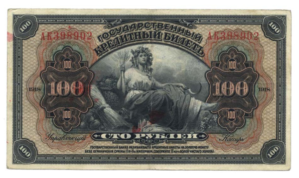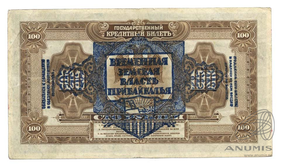 Банкнота специального выпуска: 100 рублей 1918 года «Государственный Кредитный Билет. Без подписей на аверсе». Временная Земская Власть Прибайкалья. Российская Империя/РСФСР: Гражданская война (1917 — 1923).